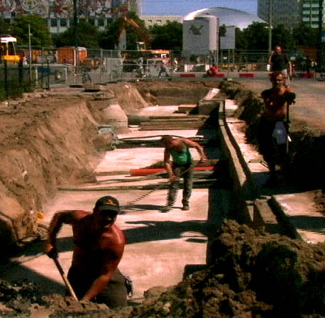 The film opens with a German woman, raised in Argentina, repeatedly smashing a neon tube against a rock in Krems. Images of industry and progress (such as commercial train tracks built during WWII in Linz, construction in 2006 at Alexanderplatz, Berlin and on the Williamsburg Bridge in Brooklyn) are contrasted with intimate details of personal routine (a woman puts on her bra, a man found through a Craigslist ad washes his feet obsessively in the shower).